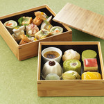 内容:マンゴーのロールケーキ、パイナップルとライムのムース、ブロンズチョコレートのムース、レモンケーキ、レモンのマカロン、はちみつのパンナコッタとグレープフルーツのゼリー、パイナップルのタルト、グラノーラ入りスコーン、セイボリー4種 ※内容は時期によって異なります