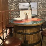 まったりと堪能したい方はご安心を。二階には座れる空間が……。酒樽をリメイクしたテーブルで、異国のバルを訪れたようなひとときを楽しめます。