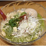 6・7月の「ポタージュサンジェルマン とグラスデュバリ」は冷たいグリーンピースのポタージュがスープの役割。麺はフェットチーネのような平打ち麺で具材はパンチェッタ、カリフラワーのアイスクリーム、村上農園のハーブがのり、「ラーメン」というより「冷製パスタ」の方がしっくりくる仕上がり。