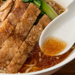実はこの店、渋谷駅前再開発で惜しまれつつ閉店した名店、「亜寿加」の味を引き継いでいるという。ラーメン愛好家が通い続けたその魅力は、丸鶏、豚ガラ、鶏ガラ、香味野菜などから取る透き通った出汁に、自家焙煎した胡麻を使った胡麻ペースト、数種類の唐辛子をブレンドした自家製ラー油で作る絶品スープ。そのスープが絡んでも負けないくらいおいしさが際立つ細めのストレート麺。そして、ほんのりとカレーの味がするカリッカリの衣を纏った三元豚のジューシーな「排骨」。これらが三位一体となって喉を通った時の破壊力は想像以上なのである。