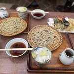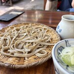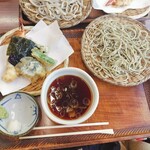 茶店風だけど真ん中に広い打ち場と製粉室があり、ほのかなそば粉の香りがしていた。木の机や箸入れも簡素ながら歴史を感じて、窓から見える新緑が心を和ませ、そばが来るのが待ち遠しくなる。僕は二八そばが好きなのでそれを注文。今日は見栄はって天ぷら付きだ。相方は生粉打ちのもり、十割の田舎そばだ。