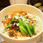 が、しかし。そこに唐辛子、ネギ、生姜のみのオーソドックスな辣油とシナモンや八角、さらに、丁子に陳皮等々8〜9種の香辛料で作るスパイシーな2種の辣油もプラス。合わせて3種類もの辣油で辛味と香りを演出した手間のかかった力作だ。芝麻醬が入っていない分、たしかに辛さに妥協がない。が、スカッと抜けるような辛さの中、豆板醤のコクがじんわりと広がり、最後まで飽きさせない。