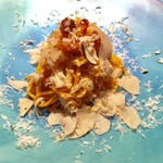 手打ちパスタで人気なのは、やはりロングパスタ。なかでも卵黄でつくるパスタ「タヤリン(タリエリーニ)」をつかった「グアンチャーレと龍の卵の濃厚カルボナーラ手打ちのタヤリン」は、多くの女性客が注文する一品。ほかのパスタに比べて、サクサクとした食感がタヤリンならでは。