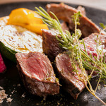 メイン料理も、グランドメニューから選ぶことができる。岩中豚や佐賀牛などのブランド肉をはじめ、仔羊や鴨肉(ブルターニュ産)、馬肉(青森産霜降り馬肉)といった比較的なじみのある食材に加えて、蝦夷鹿や猪といったジビエも揃えている。ジビエは、北海道や愛媛など信頼のおける猟師から仕入れた国内産を、天然の溶岩石でじっくりとグリルした逸品だ。