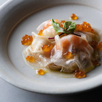 「新鮮な魚貝を自家製の千枚漬けで覆った和風セビーチェ」も人気の一品。セビーチェとはラテンアメリカでよく食べられている魚介のマリネのことで、同店ではコンブチャと土佐酢のビネグレットでマリネしている。幾重にも重なった自家製の大根の千枚漬けと旬の魚貝の意外な組み合わせは、さっぱりとした中にも奥深い味わいがある。