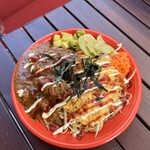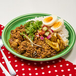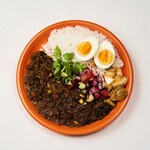 そして、にぼしポークキーマ。こちらは煮干しを使ったキーマなのですが、煮干し自体が持つ苦味を逆にスパイス的に使用することによっておいしさが上がっているオリジナルカレー。食感の変化も計算されており、紫玉ねぎの「シャク」、天かすの「サク」、挽肉の「ムギュ」っとした食感が合わさることによっておいしさの体積が広がっていました。このあたりの感覚が実にスパイスカレー的。