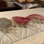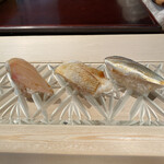 赤酢がしっかりきいた小ぶりな寿司は、一口で食べられる上品なサイズ感。寿司の間にホタテの磯辺焼きがさっと出たり、デザートにブドウが出たりと変化が楽しめるのも面白い。白エビ キャビアのせ、アジの上にネギと生姜ペーストのせ、など変化球の組み合わせが来るのがフレッシュな印象。お客には金髪のモード系女子や、20代前半と思われる男の子二人組、外国人などカジュアルで自由な雰囲気だ。